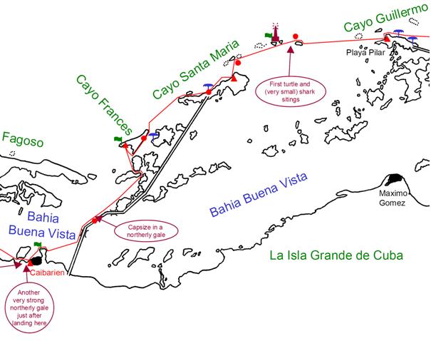 Cayo Guillermo to Caibarien<< Playa Guaney to Cayo Guillermo | Cuba2003 | Caibarien to Isabela De Sagua >> ![]() 29 April. This day started and stayed calm, to our delight as this was the biggest exposed, offshore crossing of the trip. Had it been rough, we could have circled inland though the inner line of mangrove islands, but it would have been both less scenic and much further. The northern extremity of that inner crescent of islands was two miles offshore, so the main decision for the crossing was when we got there. All was looking good in the sky so we paddled in the azure blue ocean toward the convenient beacon of the lighthouse on the appropriately named Cayo Caiman del Faro. We passed close in between a couple of large fishing boats with manned dinghies fishing between them. We headed towards the dinghies and thus between the boats both because they were on our route, and to have a look. Too late we realised that the large boats had a trawl slung between them, the dinghies being hooked up to the hawser. By the time we realised this there was no escape. Luckily our kayaks could slide easily over the rope between the floats, so they did not catch us. We stopped on the outside point of the first island in the Caimanes group, a blisteringly hot beach in the midday sun, the sky still clear, blue and calm. Then, we island hopped down the chain. Pausing between islands in the clear, calm sea, Alison saw her first turtle (I missed it), and we both saw our first and last shark of the trip, a small one circling gracefully beneath us. We stopped to talk to the Guardia Frontera at the lighthouse, sitting in the kayak holding onto the pier support while they sat on the jetty edge, yards above me. At the western island of the group we stopped again, finding some shade from the still baking sun tucked into spiky rock and prickly scrub. A large iguana came to check us out. All of a sudden the wind started to rise from the north-east, so we quickly jumped in the boats and took the shortest route to the large island of Cayo Santa Maria, our destination for the night, before the wind strengthened further. The wind did rise further if not dangerously so, and we pulled in to the nearest, north-east end of the narrow sandy beach that seemed to stretch all the way south-west to the tourist buildings we could see the outline of in the distance. We had enough water and food so we decided to camp there for the night. I walked back to look at a construction we had seen, which appeared on inspection to be the remains of an old Guardia Frontera post. 30 April. In the morning we battled with ferocious no-see-ums (jejen) while making coffee and striking the tent, and were soon glad to be paddling outside insect range of shore. We paddled into the tourist resort and pulled in to see if we could find our Rombos escort, and to get water and food. Along the walkway from beach to hotel we saw our first hummingbird or zumzum. One of the junior managers looked after us, dosing us with strong coffee and giving us a guided tour of the hotel, an all inclusive package tour destination primarily for Canadians, who spent a week there and went home again without seeing any of Cuba proper. Buying water was easy if expensive, but buying food was trickier because they were set up for the all-inclusive trade: a lot of time, negotiating and paperwork was required before we could buy an expensive packed lunch. But eventually all was sorted out and we paddled off with a few days’ supplies. From Cayo Santa Maria we paddled along the coast to the western tip, past another Guard Frontera post, and as the weather was calm took the relatively short open crossing to Cayo Frances, passing a couple of snorkellers on an offshore reef. On Cayo Frances we rested at a lovely cove, but we weren’t the only ones to find it so, as a tourist boat full of snorkellers turned up, had their obligatory twenty minute snorkelling experience, and pottered on. Opposite us on the neighbouring cayo was another huge tourist complex. We had hoped to camp on the southern tip of Cayo Frances but that proved impossible as it was pure mangroves, so we paddled to the north-west tip close to the Guardia Frontera post, pulling up close to the remains of an old jetty. An old hulk was moored in the bay, with a fishing boat alongside. We later heard claim that the hulk used to have been used as a Rombos restaurant, but were never sure whether than was true or just the Rombos crew pulling our legs, as they were want to do. We set up camp, announced ourselves to the guards who had been eyeing us through their tower-top binoculars, and had a look around. Someone had painstakingly bordered the road with rocks, but is still lead nowhere: the guard post must be resupplied by sea. We soon found out how, as the fishing boat that had been moored to the hulk sailed over and tied up to the relic of a jetty. This was remarkable as the risk of the falling tide dropping the boat onto the jagged jetty remains looked extreme. We went over to help them pull alongside and say hello. Soon we were being shown around the boat by the proud captain and his mate. The men of the Guardia Frontera came aboard also, and soon the domino set was out and the game heated up. The captain invited us for dinner, the ubiquitous and delicious black beans and rice with fish, just for us, which despite our protests meant pushing the guards off their dominoes table. I produced the rum, which crew and guards weren’t allowed, but the captain and mate drank with gusto once I’d convince them that the label on the water bottle container was a lie. For about an hour after dusk the mosquitoes were terrible, but then disappeared as rapidly as they came. Again we had the luxury of insect repellent, but the locals just took the onslaught unprotected. We were treated to a shower on boat, given advice on routes as we pored over the maps and charts, and given a small wooden fishing reel, perfect for the kayak. Th
