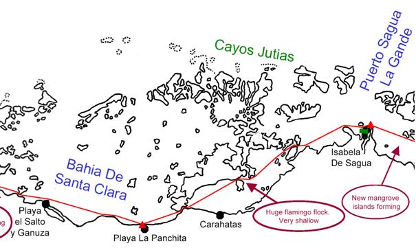 Isabela De Sagua to Playa el Salto y Ganuza<< Caibarien to Isabela De Sagua | Cuba2003 | Playa el Salto y Ganuza to Varadero >> ![]() 4 May. I left early on a fine morning, refreshed with coffee and stocked with lunch, staying mostly a mile or two off a low, featureless coast of mangroves. Along here the air chart was very useful for reckoning position, as it marked the high smokestacks and the occasional conical hill that were my only points of reference. Half way across the large Bahia de Carahatas I decided to take the northern passage between a small cayo and Cayo Las Picuas, as it looked interesting and abounded in flamingo. It was almost too interesting as I found myself towards the end twisting, reversing and feeling my way through channels inches deep, but after many attempts and different routes, and stubborn refusal to turn back until I’d tried them all, I eventually emerged on deeper water. The folding boat, that looks so fragile, stood up remarkably well to such mistreatment, albeit that worse was to come. As the far western end of Bahia de Carahatas I had the usual problem of heading towards a channel marked on the map, wondering whether it existed and if so whether it was choked with new mangrove growth. If it and the other channel were blocked, it would mean a huge backtrack to work around Cayo Las Picuas, so as I approached I hoped for that perfect channel sign, an emerging boat, but this was Cuba and there was not another boat in sight. As I got close I could see the channel but not how to reach it, as I was on the wrong side of a sunken fence line. I managed to sneak the kayak through a gap, negotiated another shallow mangrove maize, squeeze through another fence, and I was in the wide muddy channel. I followed it for a mile as it opened out into submerged fields cross-crossed with fences. After the second narrow miss of boat fabric against sunken post, and binocular searches failing to see any way through, I resigned myself to the long haul back, and extracted myself. As I headed north the real channel opened out, invisible until right alongside, so I turned in sheepish but relieved, and in no time emerged in the next Bahia, the huge Bahia de Santa Clara. The afternoon northeasters strengthened by the sea breezes were running strong, and I headed further offshore into them so that I could enjoy a downwind surf into the next town of Playa La Panchita. Playa Planchita consisted mainly of a street running the length of the seafront, houses only on the landward side, and another street running inland, houses both sides. We moved the boats onto the grass and under the shade of the ubiquitous beach umbrellas. A jovial family arrived crammed into a superb Cadillac, and positioned themselves around the neighbouring umbrella, sipping rum and relaxing in the afternoon sun. The one empty cafe had no food, but a freezer full of soft drinks. Later that evening we were entertained by boy racers, not in cars but in single horse-drawn buggies, racing each other up and down the street. That night we heard rustling and I poked my head out of the tent. Bison! The herd moved through, fortunately without trampling on us, or the boats. Pigs one night, bison the next. << Caibarien to Isabela De Sagua | Cuba2003 | Playa el Salto y Ganuza to Varadero >> |
