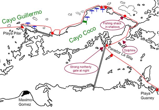 Playa Guaney to Cayo Guillerm<< Playa Guana to Playa Guaney | Cuba2003 | Cayo Guillermo to Caibarien >> ![]() 26 April. We set off at dawn again, waving adios to the caretaker and Playa Guaney, as we set off island-hopping diagonally across the lagoon. Our destination - the causeway restaurant Parador La Silla - was easy to find, being where the causeway ahead of us joined the large offshore island of Cayo Coco, one of Cuba's main tourist destinations. A stiff easterly breeze came up and chased us towards the parador, via a stop on an offshore cayo, until we could make out a tower there, and as we got closer people standing on top of it. They came down to greet us as we pulled up at the jetty there, where we left the boats to sit at the roadside cafe table for a most welcome fruit juice courtesy of our new Rombos hosts for the province of Ciego De Avila. Cuba is very provincial, with government and people alike very aware of provincial boundaries. After our Rombos friends left, the cafe owner took care of us (it was a Rombos cafe), and we had dinner and a beer or three there. A large iguana patrolled the cafe gardens, That night we got our first taste of the dreaded northerly gales, which sprang up fast after dark, violent winds with intense rain. We put up our tent inside the unfinished concrete room at the base of the tower, which unfortunately had no glass yet and the opening was towards the wind, so we stowed our gear at the far side as best we could to keep it dry, and enjoyed a night of little sleep. 27 April. By the morning the storm had passed, and we set off again, backtracking east to get around to the outside of Cayo Coco. Crossing the first, shallow lagoon we saw a small pod of dolphins jumping. The entranceway to the passage around Cayo Coco was unmarked and difficult to see from the low kayaks, as one sees only a solid wall of mangroves, and we had to take precise compass bearings to find it, although once in it widened out and was easy to follow. At one point there was a net set right across the wide channel, which we slid our kayaks over. The channel opened further as it turned north towards the road bridge and the open sea. A man was fishing from the rocks and shouted to me: he had lost his float which I retrieved for him. There was no boat traffic here so he was lucky that Cuba's only sea kayakers happened to be passing by. Our Rombos friends and the Guardia Frontera waved us through, and we carried on, as there was nowhere easy to land. The open sea was again a beautiful azure, and again there was no swell here inside the outer reef. The shore here was a low scrub and there was nowhere good to land, until eventually we came to an abandoned fisherman’s shack in the shallows way offshore. We moored the boats alongside and clambered up for shade, rest and lunch. Further west we passed outside a long mole harbouring a marina, the shiny infrastructure and vessels of this tourist area in stark contract to those we had seen in Cuba proper to date. The wind rose so we kept close to shore, which took us across the mouth of the bay Ensenada de Boutista, a mistake as it turned out, as the water inside the far point was so shallow that we had to walk, towing our kayaks behind us. Now we reached the sand beaches of the tourist resort area, with couples cavorting on the shore and on horseback. We stopped short of the first building by the first and only coconut palm, for a rest and to enjoy the relative tranquillity before arriving at the resorts themselves. I managed to pull down a green coconut using a hook on the end of the tent poles - a tricky manoeuvre in the trade winds - and we drank the refreshing milk. A couple of men came strolling along the beach, and (surprise, surprise) it is our Rombos friends looking for us. They told us where we were expected and that they'll be waving a tee-shirt for us, and wandered back down the beach. This was good advice, as it turned out, because once we were past the next curve in the coast there were resorts, crowds and little buildings dotted everywhere along. We hugged the coast, paddling through the swimmers and holiday makers, until the waving tee-shirt marked our destination, a charming little open Rombos cafe in the centre of a crescent beach, nestled just back into the low scrub. The welcome drink was most welcome. Again we chatted to our Rombos escort in their good English and our bad Spanish, and sampled the cafe's beer and food. The wind howled and there was heavy rain, as we sheltered in our tent on the sand under the eaves. 28 April. An unusually late start to let the weather settle and we were soon leaving the tourist resorts behind, although passing two more huge complexes under construction. An offshore wind rose briskly, so we paddled close in to shore rather than across the wide bay of Ensenada Puerto Coco. There was a shallow fringe reef along the coast here, and despite miles of trying I could not find an inside passage through it, so had to back out. We paddled in the deeper water just outside it, although even there we could still see the sandy bottom clearly with the see grass either side. It was like following an underwater yellow brick road. After a rest we crossed to Cayo Guillermo, paralleling the causeway a mile to our left. Cayo Guillermo too is a major tourist destination, and we paddled past more sandy beaches, shiny resorts and ramshackle jetties jutting out into the sea, and of course swarms of tourists. There were a few coconut palms along here, many more than on Cayo Coco itself. Towards the end of the resorts we saw our Rombos men waving at us, a welcome sight as Alison was exhausted, but it wasn’t to indicate our stop, but rather to wave us on to the next bay. The coast for a mile or two to the point was composed of rugged exposed rocks, low and vertical making them look further away than they actually were, and with many false points that raised then dashed hopes of an early finish. But finally we got